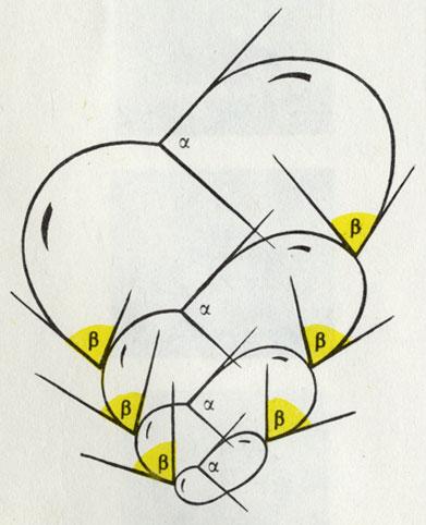 Немецкий биолог Л. Румблер выдвинул в 1910 г. теорию постоянного краевого угла при построении раковин улиток. Он исходил из того, что материал, из которого строятся раковины, вначале должен быть жидким, и в жидком же состоянии он попадает на край уже существующей части раковины, где, естественно, всегда образуется постоянный краевой угол. Под этим углом строительная жидкость затвердевает, и снова начинается та же игра. Действительно, раковина улитки может быть построена подобным методом.