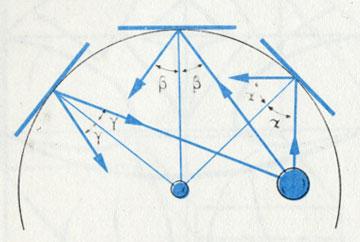 Когда в футболе, теннисе или в другой аналогичной игре мяч покидает пределы игрового поля, игра останавливается, мяч возвращают назад и один из игроков, соблюдая известные правила, снова вводит его в игру. На льду дело обстоит иначе. Поле обрамлено бортиком, прочным деревянным барьером, который отбрасывает ударившуюся о него шайбу обратно, и игра продолжается без всякого перерыва. Хоккеисты бессознательно овладевают законами отражения. Они используют правило «угол падения равен углу отражения», чтобы обыграть противника. Пока шайба ударяется о прямолинейные участки бортика, все происходит очень просто. Но совсем иная ситуация складывается в углах поля. Там бортик имеет криволинейную форму. Когда шайба отскакивает от него в таких местах, то летит, скользя по льду, в самых неожиданных направлениях. Если вы не интересуетесь хоккеем, все равно прочтите этот раздел. То, что справедливо для углов ледяной спортплощадки, справедливо и для зеркал для бритья, зеркальных рефлекторов в карманных фонариках, громкоговорителей. Во многих семьях имеются малоформатные игры для испытания ловкости. Суть их в том, чтобы загнать в луночки поля, заключенного под стеклом, один или несколько шариков. Шарики наталкиваются на стенку игрового поля, обычно имеющего округлую форму. Куда же они отскочат?