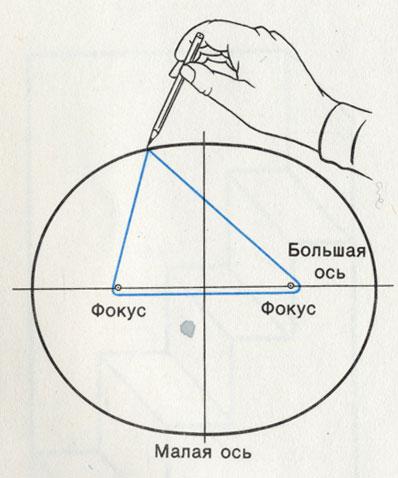 Существуют многочисленные способы построения эллипса. Самый простой из них – с помощью тонкого шпагата или нитки и двух чертежных кнопок. Воткнув кнопки в точки, отвечающие намеченным фокусам эллипса, туго натягиваем нитку, соединяющую оба фокуса, острием карандаша. Если теперь, сохраняя туго натянутой нитку, вести карандаш по бумаге, то он вычертит эллипс.