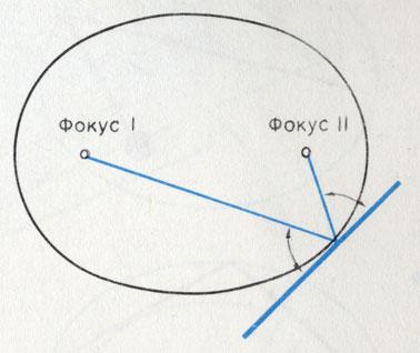 Построим в какой-нибудь точке касательную к эллипсу; тогда обе ветви нитки (радиусы-векторы) будут образовывать с ней одинаковые углы. А это означает, что если я, находясь в точке фокуса, сильно пробью по мячу в сторону эллиптического бортика, то, отскочив от бортика, мяч обязательно пролетит через другой фокус. При этом совершенно безразлично, в каком направлении пробили по мячу первоначально.