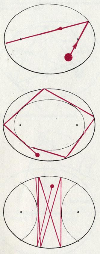 Все же мяч может оказаться в точке фокуса лишь в порядке весьма редкого исключения. Положим, он летит таким образом, что не проходит между фокусами. В этом случае он будет метаться туда-сюда возле эллиптического бортика, многократно от него отражаясь. Тогда в траекторию мяча можно вписать малый эллипс. Если же, наоборот, мяч был сразу же пробит в пространство между фокусами, то он там и останется.