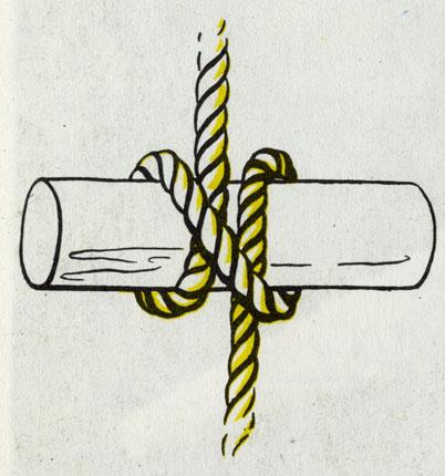 На картинках, изображающих старинные парусные корабли, видно, как матросы карабкаются на мачты по веревочным лестницам. У моряков это называется «взбираться по вантам». Ванты – это длинные канаты или тросы, которые тянутся от бортов корабля к мачте. К ним крепятся веревочные «перекладины». Эти короткие отрезки снастей должны быть прикреплены «намертво» (ни в коем случае не узлом «плоский штык»!). Как выглядит подобное закрепление, показано на рисунке. На первый взгляд оно кажется симметричным, однако это не так. Такое же впечатление производят и всевозможные декоративные узлы. Их можно встретить и в художественных изделиях, и на военном мундире.