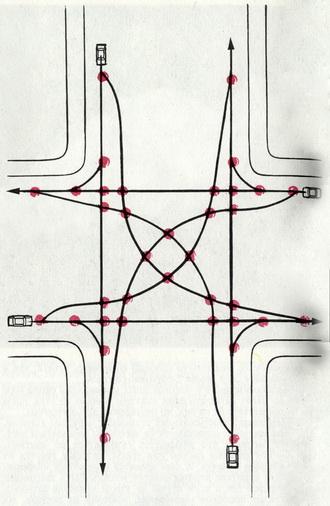 Всякий перекресток – это задача на 'узлы'. На изображенном здесь перекрестке существует 32 возможности столкновения