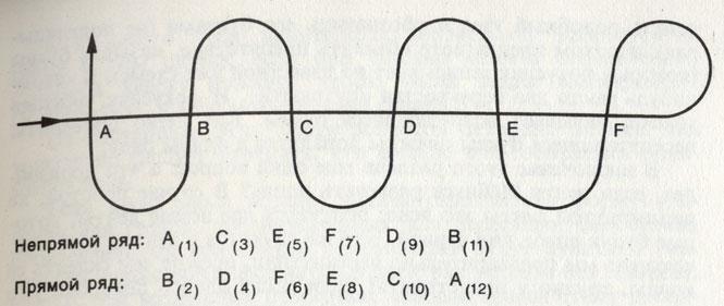 При конструировании сложных пересечений важно знать одно свойство узлов, которое мы выведем с помощью эксперимента. Нарисуйте любой транспортный узел. Он может быть запутанным и неправильным. Пометьте только каждое пересечение буквой, разумеется, в каждом случае разной. Теперь ведите карандашом или пальцем по вашему рисунку в направлении, обратном тому, в каком вы рисовали. И всякий раз, проходя пересечение, записывайте соответствующую букву. Чтобы результат (который мы стремимся найти) был нагляднее, записывайте буквы в два ряда: либо слева направо, либо сверху вниз. Важно только, чтобы вы чередовали перекрестки (в зависимости от того, проходит улица над или под другой). Причем не играет роли, каким вы приняли первое пересечение – верхним или нижним. Когда табличка будет готова и вы как следует проверите ее, то обнаружите, что каждая буква, обозначающая перекресток, встречается в каждом из рядов по одному разу.