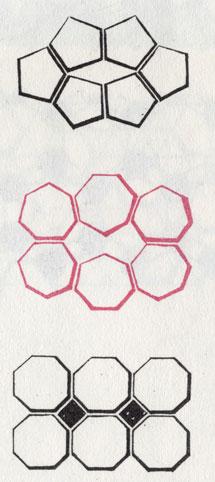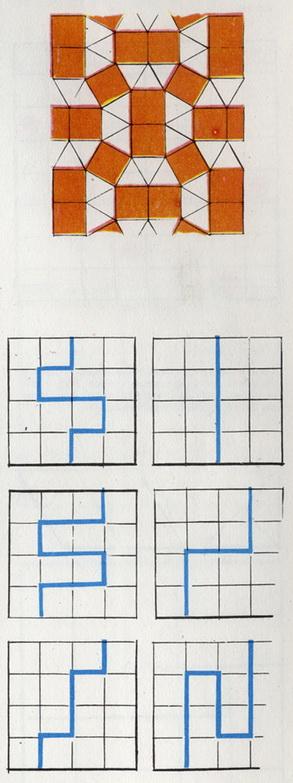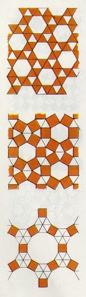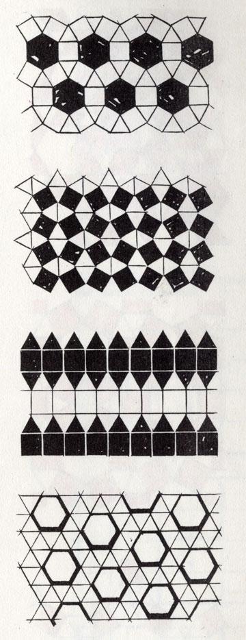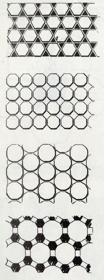 Мы уже говорили, что узор из плиток можно составить только в том случае, если взять правильные треугольники, квадраты и шестиугольники. Однако это справедливо лишь тогда, когда прикладывается сторона к стороне и угол к углу. Но эти три вида многоугольников обнаружат различия, как только мы изберем другой мотив узора для нашего пола. Квадраты и равносторонние треугольники будут заполнять всю плоскость и в том случае, если они не примыкают углом к углу. В мотиве, выложенном шестиугольниками, между примыкающими углами и сторонами образуются зазоры. Но сами эти зазоры способствуют созданию новых восхитительных узоров. Для шестиугольников существуют четыре мотива их сочетания в единый узор с треугольниками и квадратами.