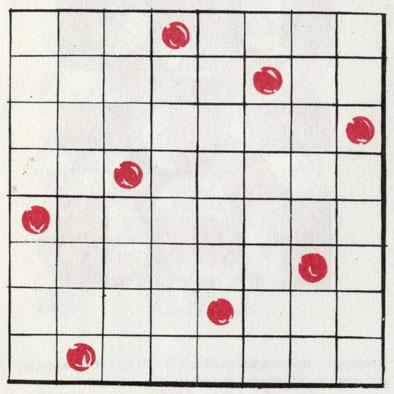 Существует множество аналогичных задач, над которыми бьются шахматисты и математики. Излюбленными остаются задачи такого рода: сколько ферзей (или слонов, или ладей) можно выставить на одну доску, чтобы они не угрожали друг другу? (Для тех, кто не играет в шахматы, следует заметить, что ферзь имеет право ходить во все стороны, включая и диагонали, сколь угодно далеко.) Любители шахмат определили, что на доске могут находиться 8 ферзей.