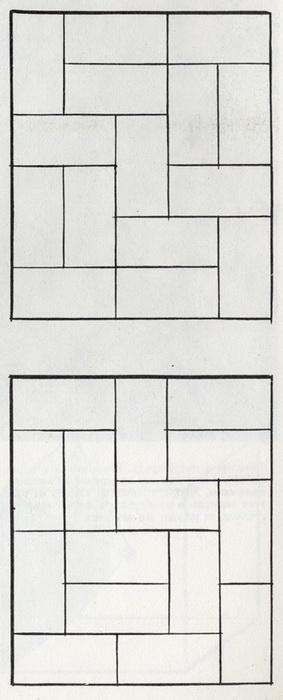 Как можно разделить пополам узор, состоящий из 2X2 плиток? Ответить на этот вопрос, разумеется, не трудно. Только одной чертой, проходящей посередине либо слева направо, либо сверху вниз и отделяющей две клетки (слева или сверху).