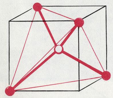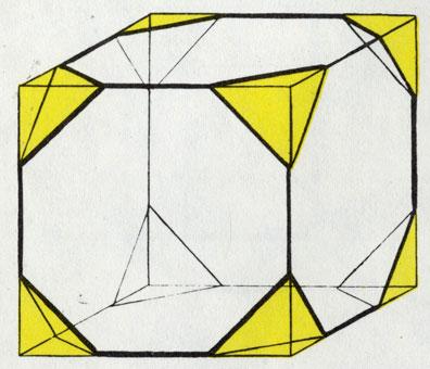 А если у вас хорошая память, вы вспомните и пентагондоде-каэдр, также входящий в этот класс симметрии. На картинке хорошо видно, как тетраэдр можно образовать из куба. Остальные Платоновы тела также относятся к кубической системе. Древние греки, надо думать, ужасно расстроились бы, знай они, что такой прозаический минерал, как серный колчедан, имеет ту же симметрию, что и их «совершенные» тела.