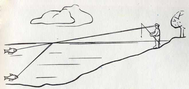 Однако вернемся к нашему рыбаку. Луч его зрения, падая на поверхность воды, преломляется. Поэтому рыба вида гея удильщику совсем не там, где она находится в действительности, точно так же, как и его собственные ноги: они кажутся рыбаку «подломленными» у поверхности воды.