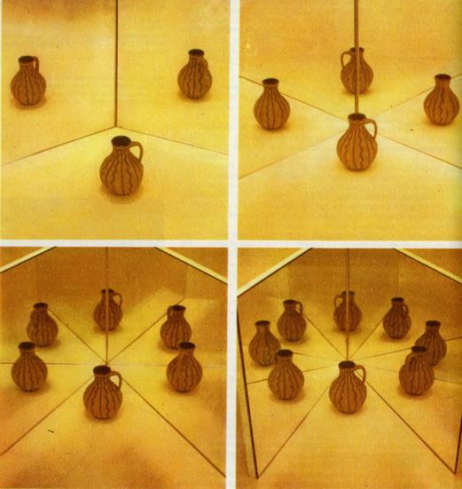 Два зеркала поставлены под углом друг к другу. Углы между зеркалами представляют собой результат деления 360° на целые числа, то есть 120, 90, 60 и 45°. В зависимости от числа, на которое производится деление, мы видим кувшин 3, 4, 6 и 8 раз. Обратите внимание на то, что кувшин совершает в зеркале 'полный оборот'