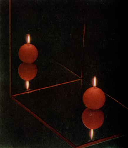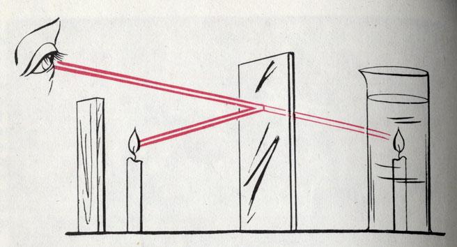 Пожалуйста. Поставьте свечу позади доски таким образом, чтобы зритель ее не видел, и отразите ее в его сторону с помощью стеклянной пластины. Зритель увидит смутное (а потому таинственное) зеркальное отражение. Если теперь позади стеклянной пластины поставить стакан с водой, выбрав такое расстояние, чтобы кажущееся изображение свечи совместилось со стаканом, то будет казаться, будто свеча в самом деле горит под водой! Конечно, этот элементарный фокус годится только для начинающих.