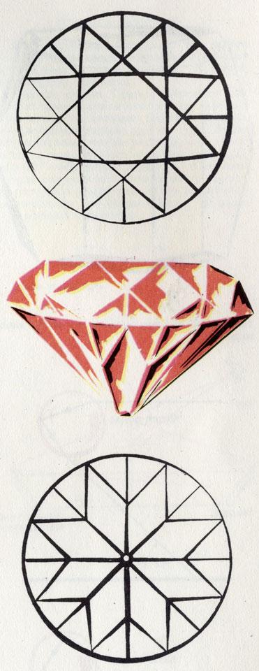 Если алмаз предназначается для украшений, для него выбирается чаще всего бриллиантовая огранка. У октаэдра с помощью тончайшего металлического диска, края которого армированы алмазным порошком, снимаются две противолежащие вершины. Верхняя часть так называемого «дикштейна» (толстотаблитчатой заготовки) должна составлять 1/3, а нижняя – 2/3 общей высоты камня. После этого камень заливается легкоплавким металлическим сплавом с таким расчетом, чтобы одна часть его оставалась свободной. Сплав помогает удерживать камень при обработке. Затем камни шлифуются металлическими дисками, покрытыми алмазным порошком.