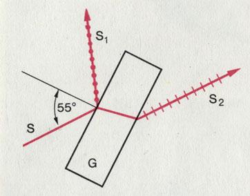 Поляризация при Отражении. Плоская стеклянная пластинка отражает часть света. При угле падения 56° (угол поляризации) отраженная часть света оказывается полностью поляризованной. Другая его часть проходит сквозь стеклянную пластинку и поляризуется частично.