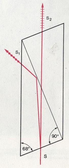 Призма Николя. Для получения поляризованного света служат двупреломляющие кристаллы; два подобных кристалла приводятся в такое взаимное положение, что в месте их соприкосновения один поляризованный луч отражается наружу и тем самым гасится, тогда как другой распространяется прямолинейно.