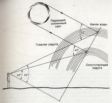 Декарт сделал то, что отличает истинного естествоиспытателя. Он построил и рассчитал ход преломления и отражения 10 тысяч (!) падающих на каплю лучей. Лучи с номерами от 8500 до 8600 отклонялись на наибольший возможный угол, составивший 42°. За пределами этого угла радуги не бывает. Цвет дуги определяется зависимостью преломления от длины волны.
