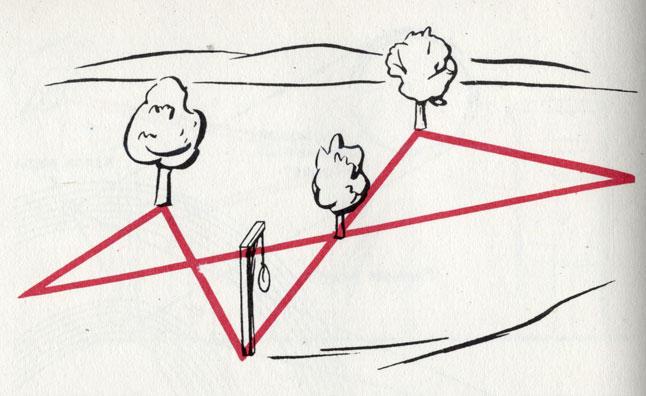 Поразмыслив вслед за прохожим, кладоискатель решает попытать свое счастье, приняв, что виселицей служит бук. И вот он тщательно отмеряет шаги от бука (то есть виселицы) до дуба. Возле дуба он сворачивает направо и делает столько же шагов. Из этой точки он намечает линию к буку и мысленно делит расстояние пополам. Ну а потом, поплевав на руки, начинает копать большую яму.