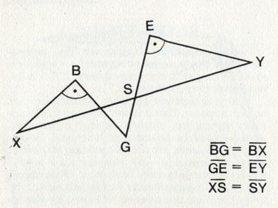 Покончив с юридической стороной дела, перейдем к математической части задачи. Вы хотели бы точно убедиться в том, что положение виселицы действительно не играет никакой роли. В рамках данной книги проверить это достаточно просто. Где лежит клад, мы уже знаем. Итак, наметим произвольную точку G и построим оба прямоугольных треугольника согласно указаниям на карте. И всякий раз мы будем снова и снова находить клад в знакомой нам точке S.