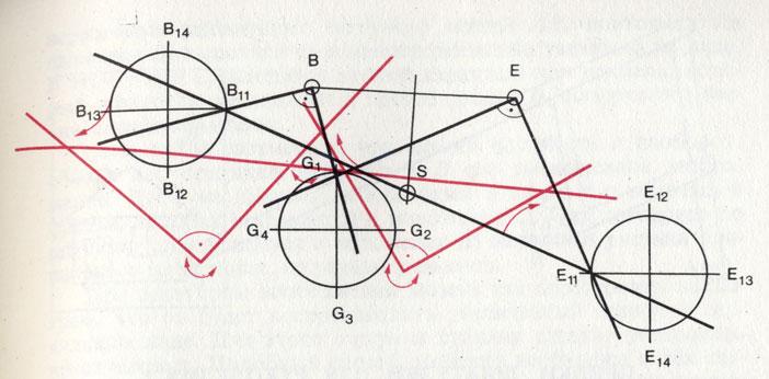 Когда G1 находится в верхней точке круга (на отметке 12 часов), соответствующие точки B1 Е1 располагаются в зеркальных позициях: B1 – на отметке 3 часа, E1 – на отметке 9 часов. Таким образом, точки В1 и Е1 смещены относительно G соответственно на +90 и -90°. Рычаг B1-S-E1 движется при этом всегда только вверх и вниз.