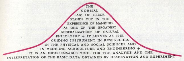 Однако в математике морднилап, кажется, еще менее необходим, чем в языке. В то же время математика не раз вдохновляла иные поэтически настроенные души на литературные излияния. Так, один английский статистик (!) по фамилии Юден создал около века назад хвалебный гимн кривой Гаусса. Он писал (в форме такого рода кривой): «Закон нормального распределения ошибок выступает в опыте человечества как одно из самых широких обобщений натуральной философии. Он служит ведущим инструментом исследования как в физике и социальных науках, так и в медицине, сельском хозяйстве или технике. Он является незаменимым орудием для анализа и обработки данных, полученных из наблюдения и эксперимента».