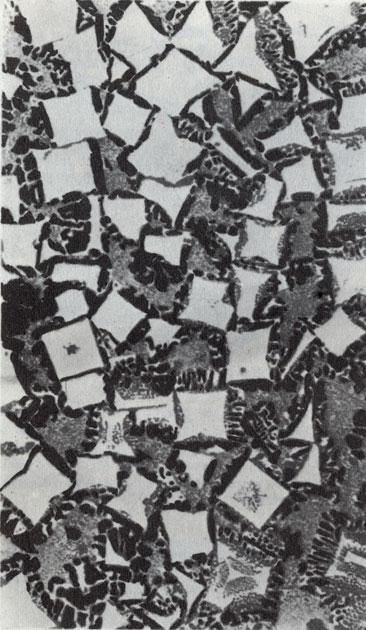 Кристаллы молибдена растут от края к середине. Обратите внимание, как некоторые кристаллы после непродолжительного роста 'уничтожаются' их соседями. Здесь ничто не напоминает о кубической симметрии кристаллов молибдена. (Увеличение 200 : 1.)