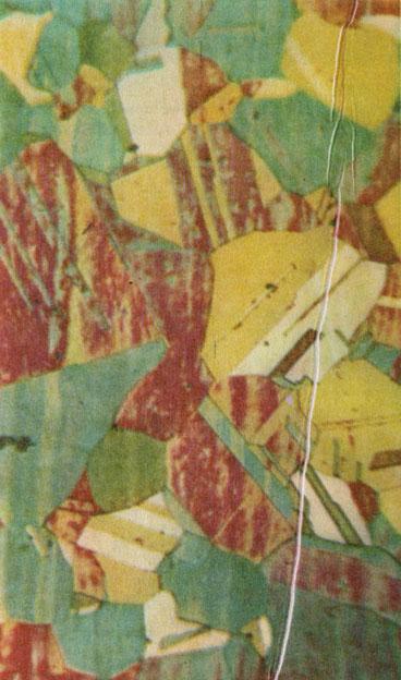 С помощью травления металлографам удается выявить в кристаллах участки различной ориентировки. Там, где на фотографии видны полосы, пересекающие кристалл, присутствуют двойники. (Увеличение 200 : 1.)