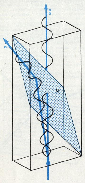 Между тем техники научились использовать поляризацию света для самых различных целей. Теперь изготавливаются большие поляризационные фильтры. Они состоят из бесчисленного множества параллельно ориентированных игольчатых кристаллов сильно поляризующих веществ, нанесенных на тонкие пленки. Такие фильтры применяются, например, в фотографии для защиты от мешающих отражений (бликов) (Изучение оптических свойств минералов также ведется главным образом в поляризованном свете, при помощи поляризационного микроскопа (снабженного поляризатором и анализатором). – Прим. перев).