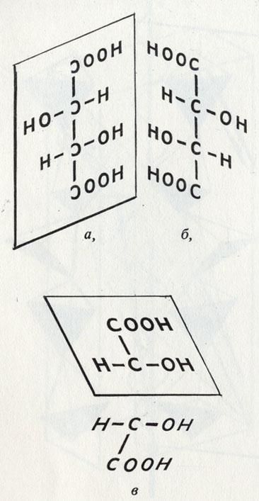 Строение молекулы винной кислоты допускает три варианта: L-винная кислота (а), D-винная кислота (б) и мезовинная кислота (в)