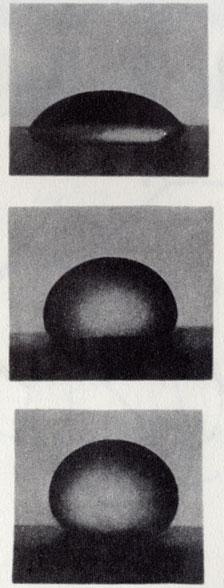Краевой угол между каплей и подложкой служит мерой смачиваемости. Расплывшаяся капля на снимке сверху смачивает подложку, а капля снизу – нет