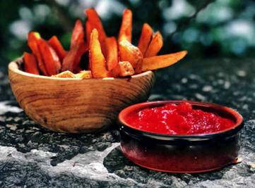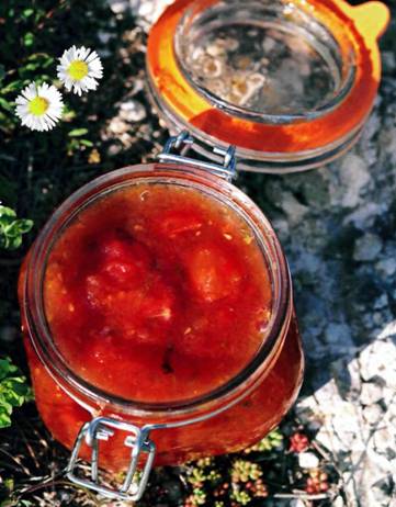 Идеально к шашлыкам, жареной баранине, птице, приготовленных на «кавказский» манер. Если делаете из свежих помидоров, их надо взять где-то около 3 кг, лучше сливовидных, уварить, как в предыдущем рецепте, примерно до 1 л, затем протереть от шкурок и семян через сито. Если лень, можно взять, 2 банки резаных томатов и 200 мл пассаты, или наоборот, 600 мл пассаты и 1 банку резаных томатов. Обратите внимание: томатное пюре – это не томатная паста!