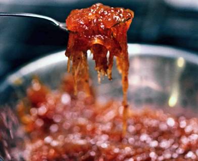 • Положить в тазик для варенья, засыпать сахаром, смешанным с пектином, добавить целые звездочки бадьяна, сок лимона, аккуратно перемешать и дать закипеть на медленном огне. Дать сахару полностью раствориться и через пару минут выключить. Не перемешивать очень активно. Оставить на плите до завтра.
