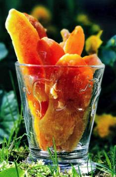 • Цедру очень тонко нарезать полосочками. Залить холодной водой, довести до кипения, слить и хорошо промыть холодной водой. Повторить еще 1-2 раза.