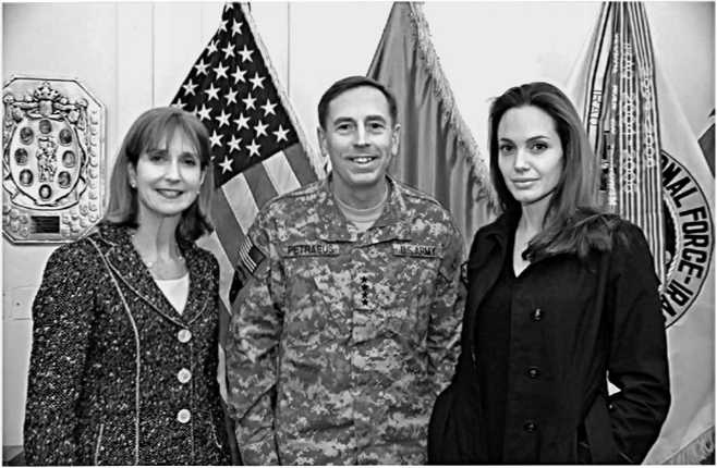 Фотография запечатлела момент встречи актрисы Анджелины Джоли с Полой Добрянски и командующим оккупационными силами в Ираке Д. Петреусом перед отправкой с «гуманитарной миссией» в Багдад 7 февраля 2008 г.