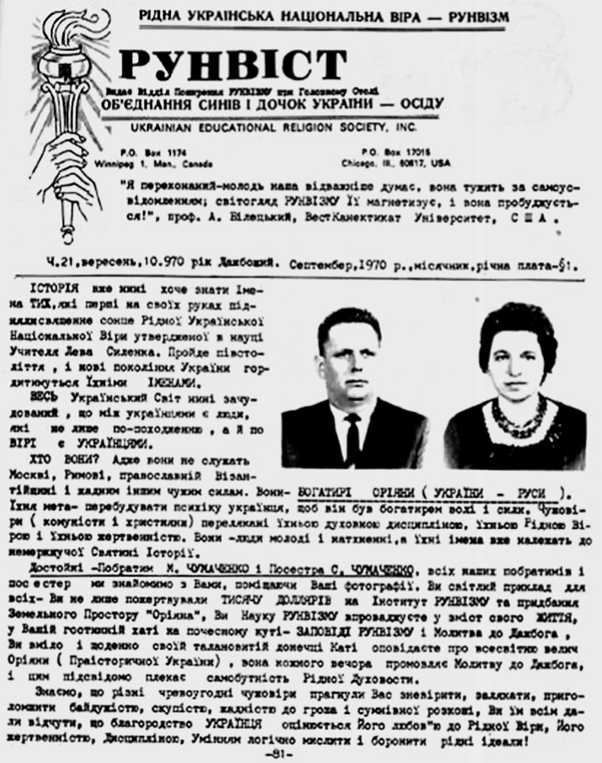 Информационный бюллетень церкви «РУН-Виры» «Рунвист» от 21 сентября 1970 г. (21 вересень 10 970 г., согласно летоисчислению церкви). Издатели: Объединение сынов и дочек Украины (Канада) и Ukrainian Educational Religion Society, Inc. (штат Мичиган, США).