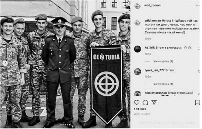 «Центурии» удалось завербовать в академии будущих представителей военной элиты Украины. Ряд ее членов также получили доступ к западным военным учебным и подготовительным учреждениям. Один из членов, на тот момент курсант Кирилл Дубровский, в 2020 г. прошел 11-месячный курс подготовки офицеров в Королевской военной академии Великобритании в Сандхерсте, который он окончил в конце 2020 г. Очевидно, что на протяжении этого периода он поддерживал связь с группировкой[184]184