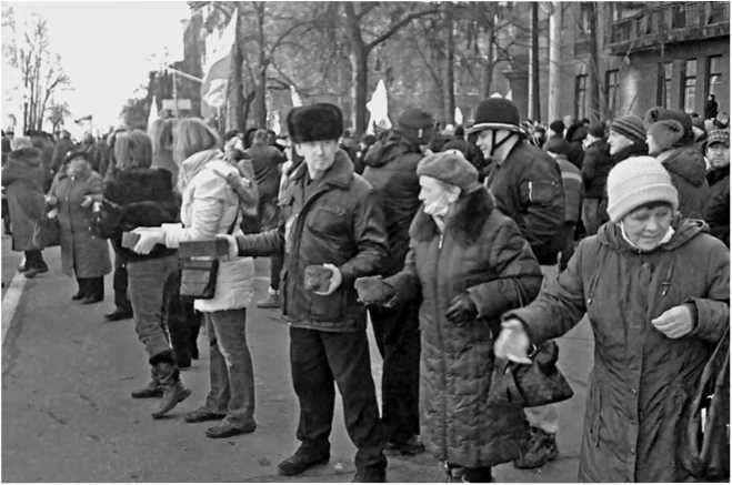 Постсоветское украинское общество оказалось не просто толерантным, но готовым принять национализм. Кадры многих массмедиа зафиксировали, как осенью 2013 г. киевские пенсионеры выстроились в «живую очередь», чтобы передавать майданным праворадикалам брусчастку против сил правопорядка.