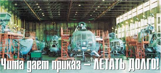 Читинский АРЗ предлагает капитально-восстановительный ремонт вертолетов Ми-24, Ми-8 и их модификаций, капитальный ремонт агрегатов всех систем с восстановлением ресурса и гарантийное обслуживание винтокрылых машин в течение всего межремонтного срока службы.