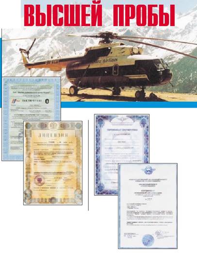 – лицензия Минэкономики РФ на ремонт вертолетов типа Ми-8, Ми-14, их комплектующих изделий и составных частей, модернизацию и доработку;