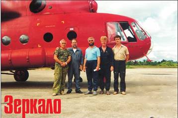 Экипаж вертолета Ми-17 (М. Мубаракшин – первый слева) во время перелета по маршруту Монауз – Тефе -Табатинта – Икитос. Бразилия-Перу, 1994 г.