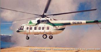 Очень коротко расскажу о результатах работы. Всего за семь летных дней было выполнено 46 полетов с общим налетом 16 часов 42 минуты. Максимальная высота динамического потолка со взлетным весом 8960 кг (высота взлетной площадки 3676 м) составила 7950 м. Максимальная высота площадки, на которую совершалась посадка вертолета с выключением двигателем, их охлаждением в течение 34 минут, запуском и взлетом по-вертолетному (взлетная масса 9000 кг), – 5357 м. Максимальная дальность полета вертолета с грузом 1400 кг на борту на высоте 6000 м достигла 610 км. Максимальная высота запуска ВСУ SAFIR составила 6250 м, а максимальная высота запуска двигателей ВК-2500 чуть меньше – 6000 м.