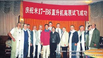 Когда полеты были выполнены и отчет написан, нас пригласили на встречу с заместителем Главы Тибетского автономного района господином Ченом, и тут выяснилось, что за нашими успехами наблюдали не только специалисты-вертолетчики, но и тибетские чиновники самого высокого ранга. Было очень приятно, войдя в зал, увидеть лозунг «Поздравляем с успешным окончанием испытаний вертолета», написанным, правда, по-китайски, услышать добрые слова в адрес российской команды вертолетчиков. Честно говоря, все эти слова были вполне заслужены: китайцы смогли оценить и наш профессионализм, и нашу бытовую непривередливость, а главное, умение быстро и четко работать.