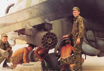 Стандартным вооружением Ми-24 были два блока НАР Б-8В-20, пушка ГШ-2-30, пулемет ЯКБ-12,7 и 2-4 ПТУР 9М114 «Штурм». В основном использовались неуправляемые авиационные ракеты С-8К0 с кумулятивно-осколочной боевой частью и встроенным пьезоэлектрическим взрывателем. Гораздо реже использовались С-8Д (ДМ) с объемно-детонирующей БЧ. Выбор боеприпасов не зависел от выполняемой задачи: использовали то, что завозили на склад. Боекомплект пушки, как правило, состоял из 150-200 снарядов и пополнялся по мере необходимости или после его полного отстрела. Пушка всегда была у летчиков в почете за точность боя и безотказность. Правда, дважды пушка отказывала из-за окисления контактов во влажном климате Северного Кавказа. Показал себя с самой лучшей стороны пулемет ЯКБ-12,7. За время нашей командировки (и работы наших сменщиков) не было ни одного сбоя! Секрет оказался прост – добитая и обильно смазанная лента шла по рукаву без зацепов и перекосов. При этом во время стрельбы пулемет дополнительно смазывался, что было необходимо при большой влажности воздуха.