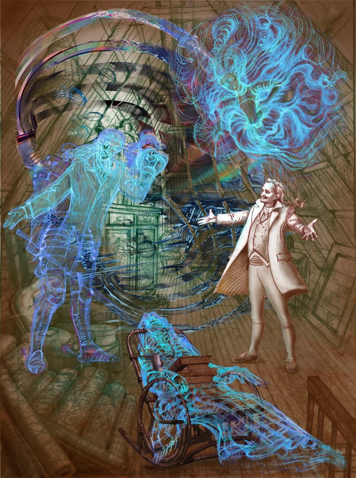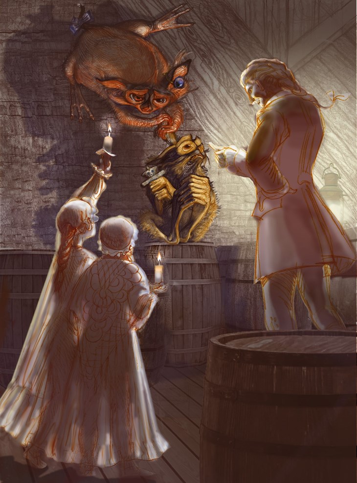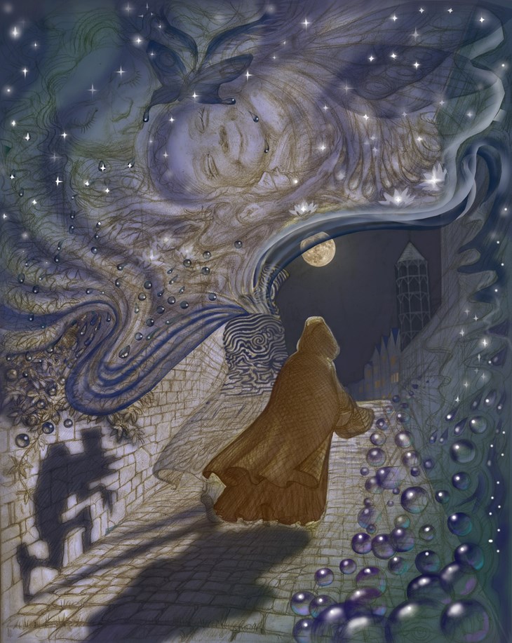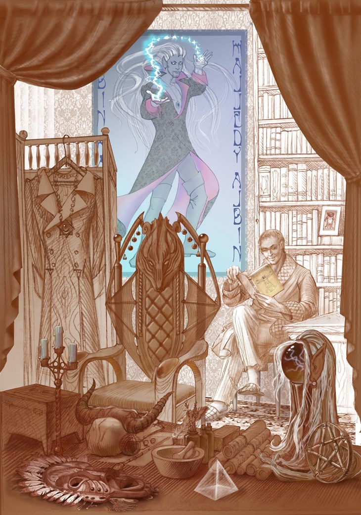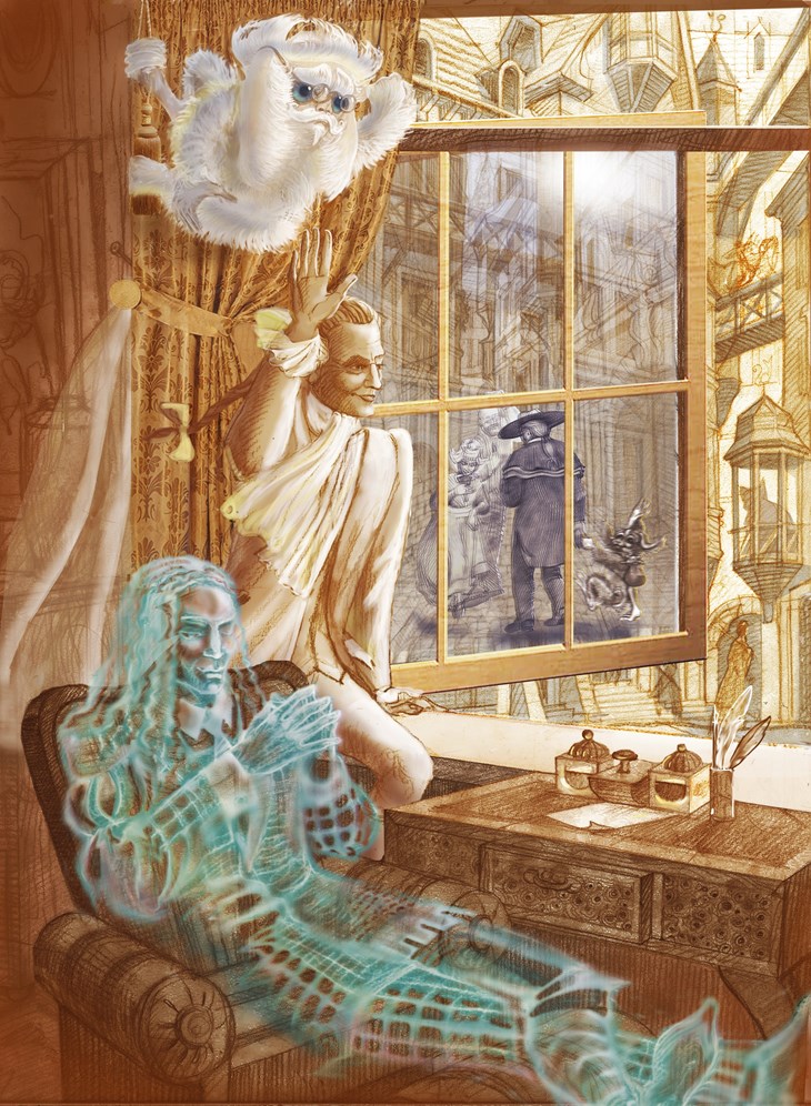 Карэле, бросив последний взгляд на медленную ночную реку, отходит от окна. Взяв со стола подсвечник, он неспешно идёт к двери, но на пороге оборачивается и, задумчиво улыбаясь, ещё раз оглядывает свой кабинет, где его всегда ждут книги и рукописи, тайны и воспоминания.