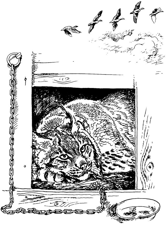 Первое желание Риссы было поймать эту самоуверенную птицу. Но рысь смутно понимала, что она в неволе и не может, как в лесу, охотиться на петуха или на другое животное здесь, во дворе. С рассветом петух взлетал на забор и пел. Сначала это беспокоило Риссу, потом она постепенно привыкла к его резкому крику.