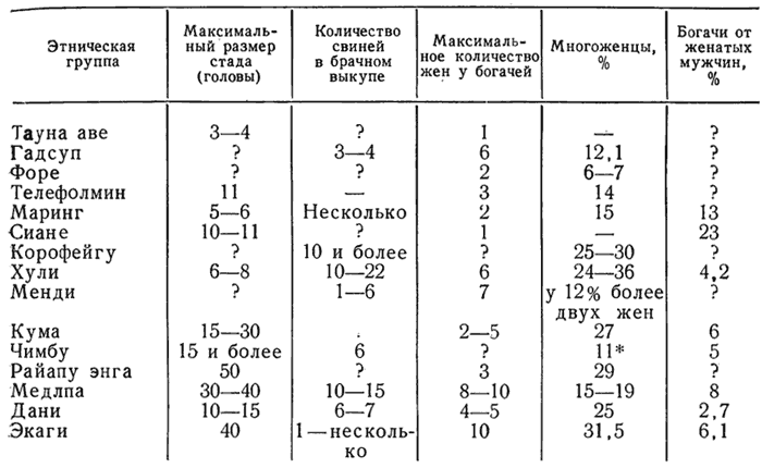 Табл. 3 показывает устойчивые тенденции развития института «больших людей» в нагорьях. Чем более развитым является общество, тем больше богатства скапливается в руках «больших людей», тем больше жен они имеют, но в то же время тем уже становится круг «больших людей». Таким образом, с развитием общества богатство все более становится привилегией избранных, разрыв между богатством и бедностью нарастает.