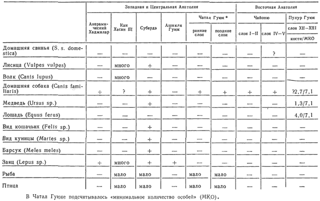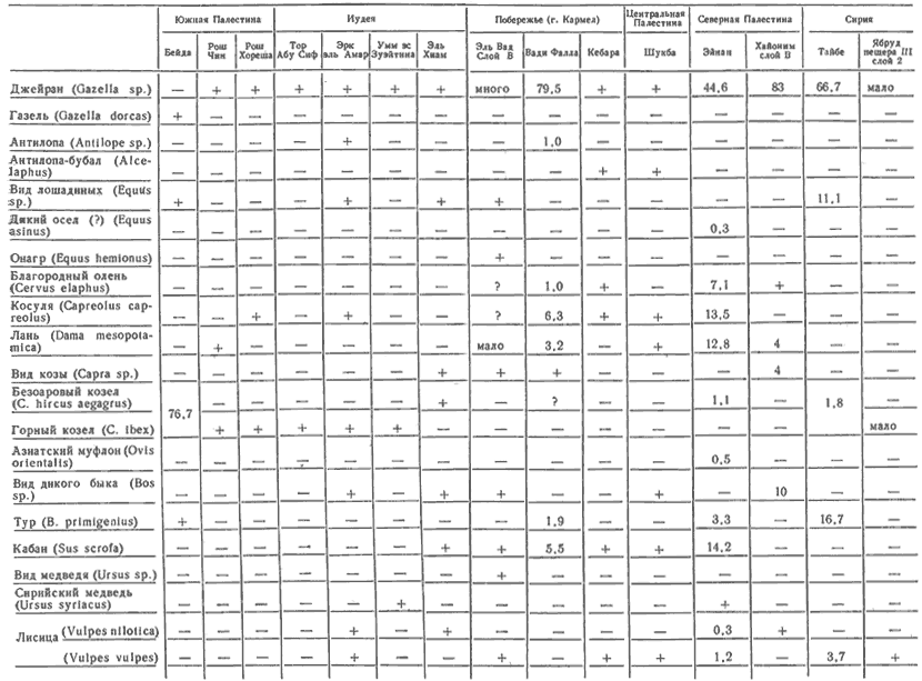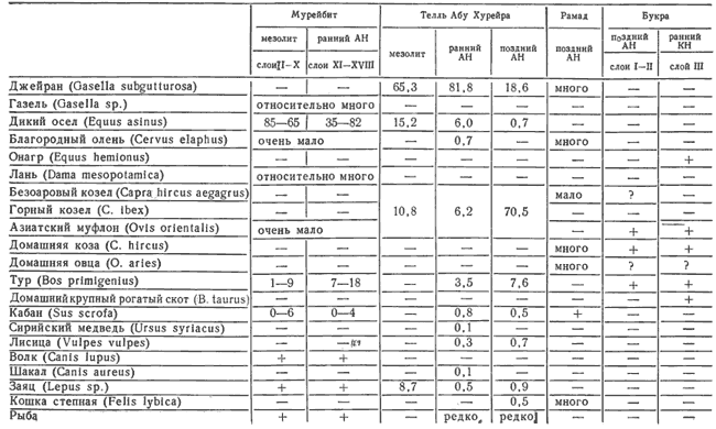 Благодаря тесному сотрудничеству археологов и палеозоологов в последние годы появились подробные сводки данных, характеризующих охоту и скотоводство на разных этапах первобытной истории. Правда, в связи с особенностями развития археологических исследований составление таких сводок оказалось возможным лишь для ряда наиболее изученных районов. Так, весьма полно представлены материалы, происходящие с первобытных памятников Европы. Напротив, фаунистические исследования, проводимые в Африке, Восточной и Юго-Восточной Азии, Южной Америке, пока что редки и зачастую неудовлетворительны. Иная ситуация сложилась в Передней Азии. В течение последнего двадцатилетия здесь работала группа квалифицированных специалистов-зоологов, усилиями которых были получены ценные фаунистические данные, относящиеся к периоду становления скотоводства. Однако до сих пор эти данные не были сколько-нибудь полно систематизированы. Ниже приводится наиболее полная их сводка. Что же касается других регионов, то в составленные по их материалам таблицы вошли данные лишь с наиболее изученных памятников. Единственное исключение представляет Европа. В связи с тем что происходящие отсюда коллекции неоднократно систематизировались и публиковались [351; 496; 819], в соответствующую таблицу вошли данные лишь по культуре лепенски вир, носители которой, возможно, самостоятельно одомашнили свиней.