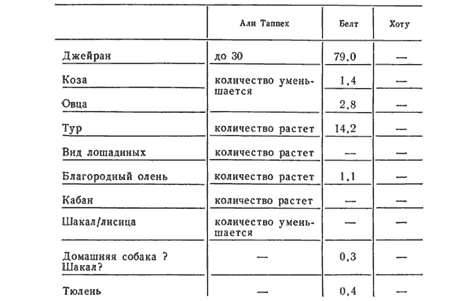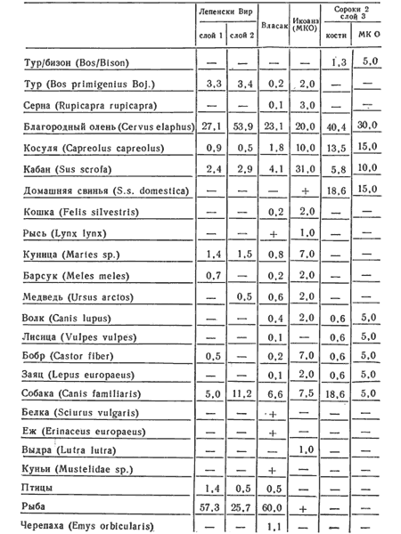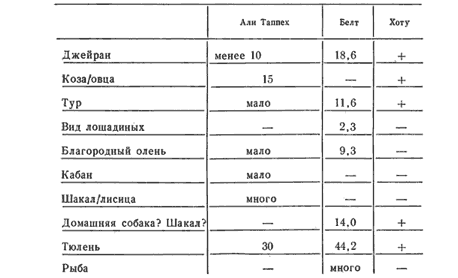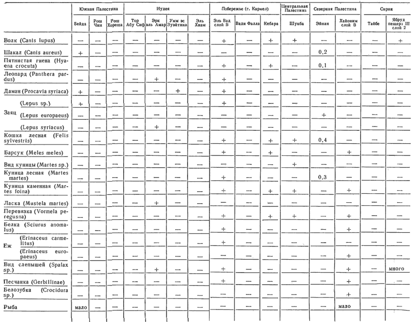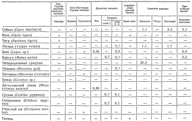 При работе с таблицами необходимо учесть следующее: 1) прежде зоологи ограничивались лишь констатацией факта наличия или отсутствия тех или иных видов животных и только с 60-x годов они начали использовать статистику, да и то не везде. Учет подобного рода данных свелся в работе к фиксации наличия животных с помощью знака (+); 2) до недавнего времени подсчеты производились по общему количеству костей, а не по минимальному количеству особей (МКО), что нашло отражение и в таблицах, где учет МКО оговаривается особо; 3) видовое определение костей мелких копытных далеко не всегда было возможно, что заставляло давать их суммарное описание; 4) во всех таблицах, кроме таблицы 16, соотношение общего количества костей и МКО дано в процентах.