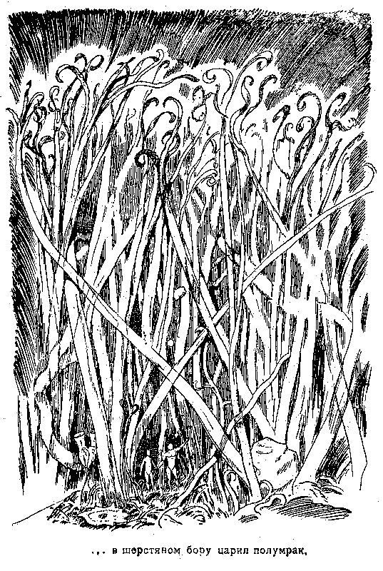 Хотя громадные шерстяные стволы были лишены кроны, расщепляясь лишь на самых верхушках на три-четыре меньших ствола, и голыми черными силуэтами маячили над головами двух затерявшихся среди них человечков, совсем не закрывая от них «неба», – в шерстяном бору царил полумрак. Электрической лампочки не было видно, и даже никакого зарева не намечалось вместо нее. Теперь светился сам воздух, волнообразно колеблясь; светились все предметы, испуская непохожий на обыкновенный свет. И все-таки было темно из-за густоты «растительности».