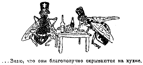 Там уже сидел добрый десяток этих насекомых. Они ползали, прыгая друг через друга, среди крошек хлеба, сахара и колбасной кожуры; взлетали и садились на горбушку хлеба, на стакан с сладким чаем, заглядывая осторожно внутрь его и трогая хоботком поверхность жидкости, и не так много ели, как пачкали грязными лапками стол и оставленные на нем съестные продукты.