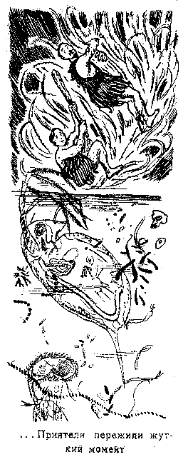 Он снова оказался пророком. Громадное животное – по всей вероятности, лягушка (приятели не могли охватить ее глазом) – обеспокоенное скоплением в одном месте большого количества живности, покинуло недра лужи и, высунув морду, слизнуло с взбаламученной поверхности десятка три из нарушителей порядка. В этот же миг камнем упало сверху еще более громадное животное – очевидно, птица; лягушка повисла в крючковатых лапах ее, продолжая делать плавательные движения. Птица, хлопнув крыльями по воде, вместе со своей жертвой торжественно-плавно вспарила кверху. Перышко приятелей, плясавшее дикую тарантеллу на гребнях волн уже в момент появления лягушки, при появлении воздушного хищника оторвалось от воды, выкинуло пассажиров, как ненужный балласт, и скрылось неизвестно куда… Пассажиры были подхвачены водоворотом событий и воздушным смерчем, взревевшим, как две тысячи котов… (Последнее сравнение не гиперболизировано: ведь наши путешественники слышали звуки от столкновения бесчисленных молекул-частиц, из которых состоит воздух).