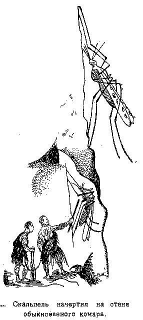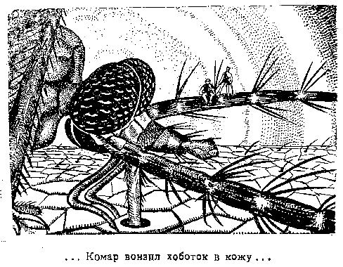– Расчувствовался и слюну пустил, черт полосатый! – Николка сплюнул в негодовании. А когда в слюне промелькнули вниз одна за одной острые змейки, он, легко догадываясь об их назначении, пришел в столь неописуемое возбуждение, что, не задумываясь, пустил свое единственное оружие – дубинку – в глаз отравителя. Острые змейки были малярийными плазмодиями. Комар поднял переднюю лапу, стер ею прилипшую к оболочке глаза дубинку, приняв ее за обыкновенную пыль, и, как ни в чем не бывало, продолжал свое дело.